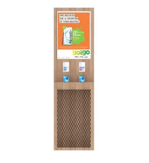 Se trata de un panel fabricado en madera de pino, con una balda para exponer 2 teléfonos, por tanto, debe tener 2 sistemas de alarmado conectados a la corriente y 2 metacrilatos plegados de tamaño 10x15 cm. situados en la parte trasera de los móviles para meter las cartelas de precio.